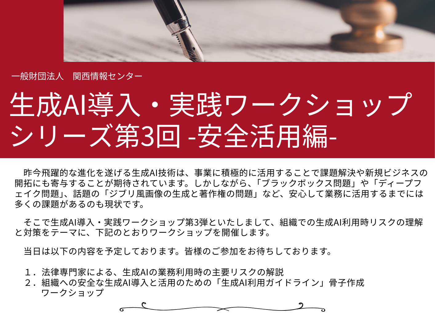 【第3回 安全活用編】KIIS 生成AI導入・実践ワークショップ ▶詳細(チラシ)はこちら 3rdGenAIWorkshop お申し込みフォーム 必要項目をご入力いただきますと、確認画面が表示されます。 内容が問題なければ、ページ最下部の確認ボタンを押して下さい。 入力 確認 完了 氏名 メールアドレス 会社名・団体名・学校名など ※会社・団体・学校などに所属されていない方は「個人」とご記入ください。 所属・役職 業種 小売業 製造業 建設業 飲食業 サービス業 その他 生成AIの業務利用状況 業務で利用中(所属先が組織として利用環境を用意している) 業務で利用中(個人で契約、あるいは無料プランを使用) 業務では利用していない 現在利用中の生成AI(該当する方のみ) ChatGPT Gemini Claude Copilot Grok その他 生成AIを業務利用するにあたり、お困りごとやご心配ごとがあればご記入ください 「個人情報の取り扱いについて」 当財団は、プライバシーマークを付与認定され、個人情報保護マネジメントシステムにより、個人情報を次のように取り扱います。 ○組織の名称:一般財団法人関西情報センター 個人情報保護管理者、連絡先:総務企画グループ グループマネジャー TEL 06-6809-1093 ○個人情報の利用目的について 申込書にご記入いただいた個人情報については、下記の目的で利用させていただきます。 ・当セミナー開催に係るご連絡やご案内のため ・参加者の把握のため ・セミナー運営に関する事務業務 ・当財団が主催する普及啓発活動に関する案内を送付するため ○個人情報の第三者提供について 個人情報の第三者提供について:以下のとおり提供します。 ・提供の目的:参加者の把握及びご本人へのアクセス ・提供先:株式会社BESW ・提供する項目:ご記入いただいた全項目 ・提供の手段:電子メール ・個人情報の取扱いに関する契約有無:無 ○個人情報の取り扱いの委託について ご記入いただきました個人情報につきましては、その取り扱いの一部を委託する場合がございます。 ○保有個人データの開示等および問い合わせ窓口について ご本人(又はその代理人)からの求めにより、当財団が保有する保有個人データの利用目的の通知・開示・内容の訂正・追加又は削除・利用の停止・消去又は第三者への提供の停止、第三者提供記録の開示のご請求があった場合、遅滞なく対応します。 イノベーション創出支援グループ TEL:06-6809-2142 ○ご本人が個人情報を与えることの任意性及び与えなかった場合の影響について 個人情報の項目への記入は任意ですが、必要とする個人情報の項目についてご記入がない場合は、当該セミナーへ参加をお断りする場合があります。 ○ご本人が容易に認識できない方法によって個人情報を取得する場合 本サイトの改善のために、Google社が提供しているGoogle Analyticsを利用する場合があります。Google Analyticsは、Cookieを利用して、本サイトへのアクセス情報等を、個人を特定することなく収集・記録・分析します。詳細については、当財団の「プライバシーポリシー」(https://www.kiis.or.jp/privacy/)をご覧ください。 上記の内容に同意して確認する